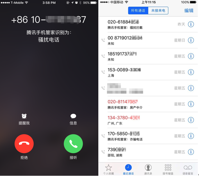 (图:腾讯手机管家iOS版识别骚扰电话)