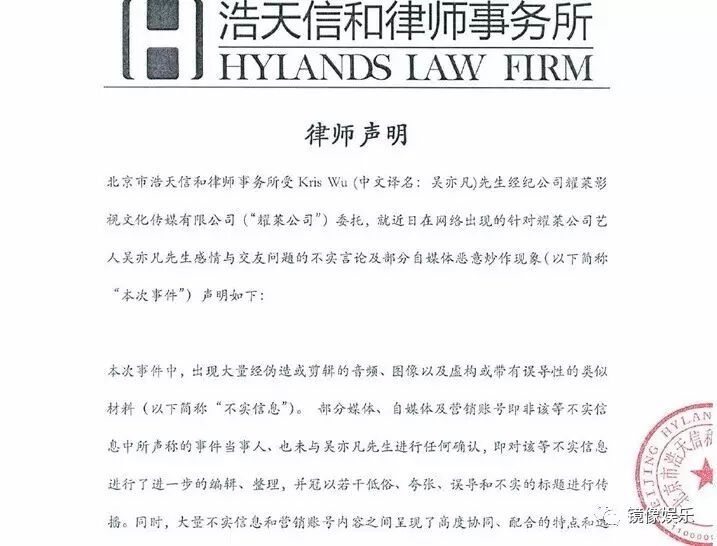 去年吴亦凡“约炮门”被爆出,舆论一片哗然,但吴亦凡却在风口浪尖签约了耀莱,此后,耀莱接手“约炮门”公关事件,委托浩天信和律师事务所发出律师声明。