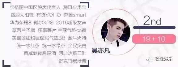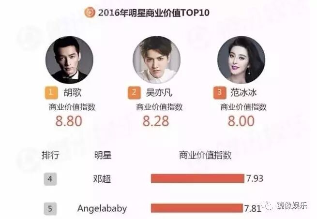 在2016年底腾讯娱乐白皮书数据中,2016年明星商业价值排行里吴亦凡排名第2,仅次于胡歌,超过了范冰冰、邓超、Angelababy等人。
