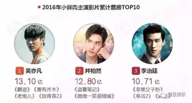 2016年腾讯娱乐白皮书数据显示,吴亦凡以13.10亿的票房成绩稳居“小鲜肉主演影片累计票房TOP10”第一。虽演技一直备受质疑,但其的电影资源确实比其他小鲜肉优越不少。
