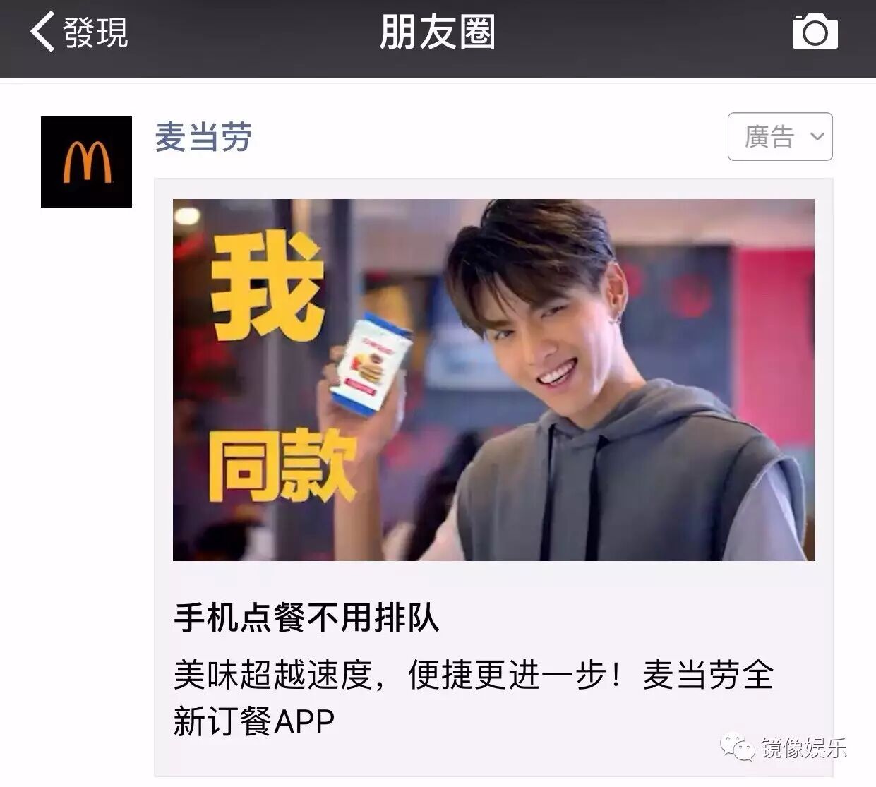 吴亦凡最近有点忙,除了要搞嘻哈,还要推广麦当劳。今天,麦当劳在微信朋友圈推送了吴亦凡同款点餐APP,这也是麦当劳自2007年后首次启用明星代言人。