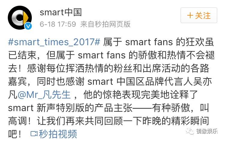 吴亦凡从回国至今,身上的标签就是“国际化路线”、“潮流”、“高调”、“追逐梦想”等,这是他身上异质化其他小鲜肉的地方,也是品牌看好的部分。欧莱雅男士标榜的就是吴亦凡的奋斗和正能量,而奔驰Smart主打的则是吴亦凡身上和奔驰Smart同质的“高调”。