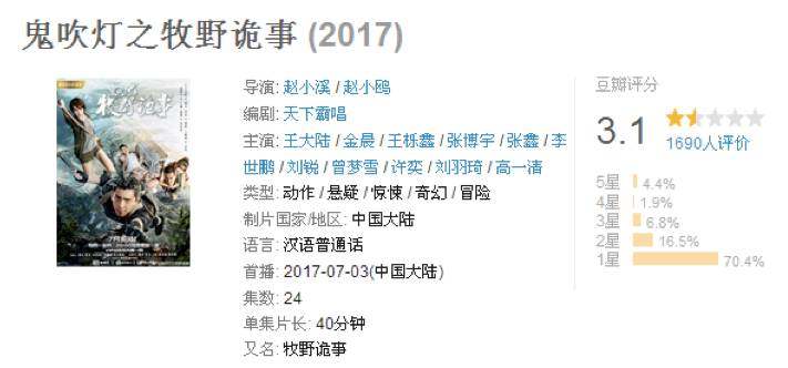 结尾:不同版本的《鬼吹灯》自然有着属于自己独一无二的风格,最终网友们会接受哪个版本,《牧野诡事》又是否真的会以惨败告终,这些都还是未知,但不久的将来,大数据会告诉我们最终的答案。