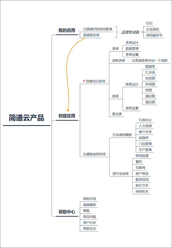 上文对这款产品都是泛泛而谈,简道云的应用该如何创建?又能实现什么功能?要如何学习?首先了解简道云整个产品框架: