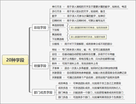 下图为针对用户需求的20种字段,对每一个字段进行控件属性的设置,就可以衍生出N种玩法: