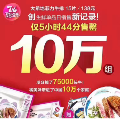 7月16日,云集石榴节,云集微店联手大希地牛排共同打造了一场“ 全网底价 爆款牛排138元”促销活动。谁也未曾预料到,原本的一场生鲜淡季的促销活动,竟然创造了生鲜行业的全球旺销纪录,短短 5小时内,平台活动储备的10万份(150万片)大希地牛排竟被抢购一空,销售额近1400万。这一数字已经创造了单品牛排的销量的单日之最,与天猫商城销冠牛排商铺的月度最高销售量持平。
