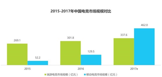 根据艾瑞资讯的统计数据,2017年中国移动电竞市场规模将达到462亿,同比大幅增长256.7%。这一市场规模大于端游电竞的337.6亿元,首次出现反超,而在2016年,端游电竞和移动电竞的市场规模还分别为301.8亿元和129.5亿元。