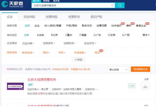(天眼查中搜索某知名律师事务所显示的基础信息)