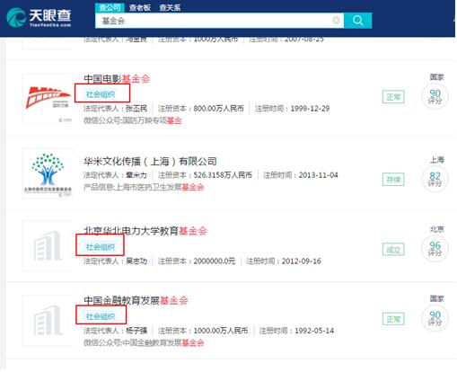 在社会实体维度上,天眼查现可提供如基金会等社会组织的信息查询。在天眼查搜索栏里输入基金会或其他社会组织名称,即可出现大量相关结果,并附有相应“社会组织”标签。如下图中在组织名称下方蓝色框里对“社会组织”的标注。