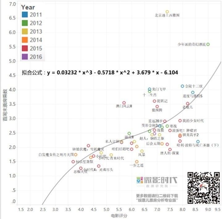 从上图可以看出豆瓣评分在5.5分-7.5分之间,它的坡度是很小的,就是在这个阶段的电影多一分少一分对于它的最终票房影响不是特别大。影评人从古至今就对票房没有什么贡献,只有当主创处理方在影片失败的时候,才需要影评,有个慰藉自己的东西或者发泄的渠道。