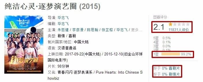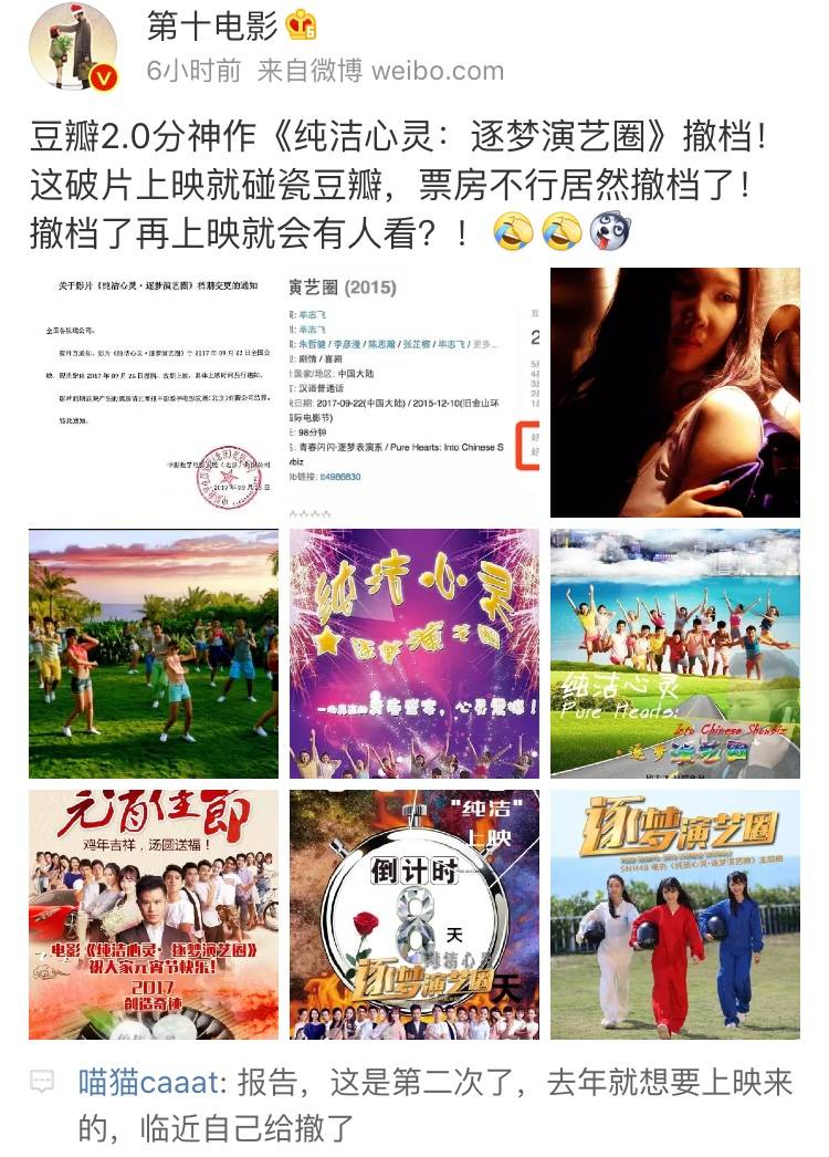 这两天撤档的电影有点多,先是冯小刚早就定档国庆的《芳华》撤了,另外一部是已上映5天的《纯洁心灵·逐梦演艺圈》,今天也撤档了。与《芳华》撤档的惋惜不同的是,这部电影遭到了网友的集体炮轰。