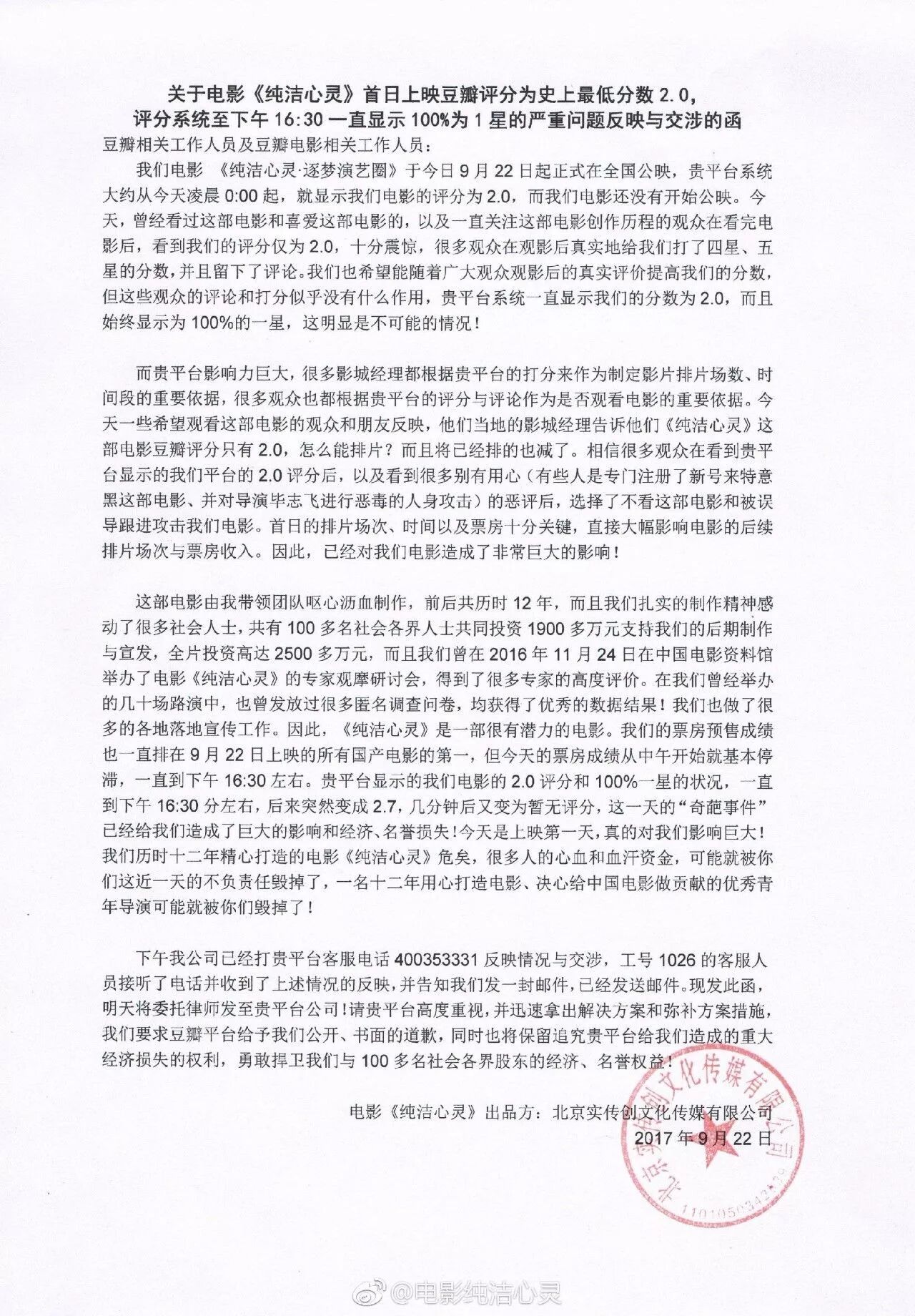 简言之,这个声明的意思就是我们的电影满是专家好评,但豆瓣不予采纳,恶意给我们打一星差评,这影响了电影的排片,我们要求道歉,并赔偿精神损失吧啦吧啦。