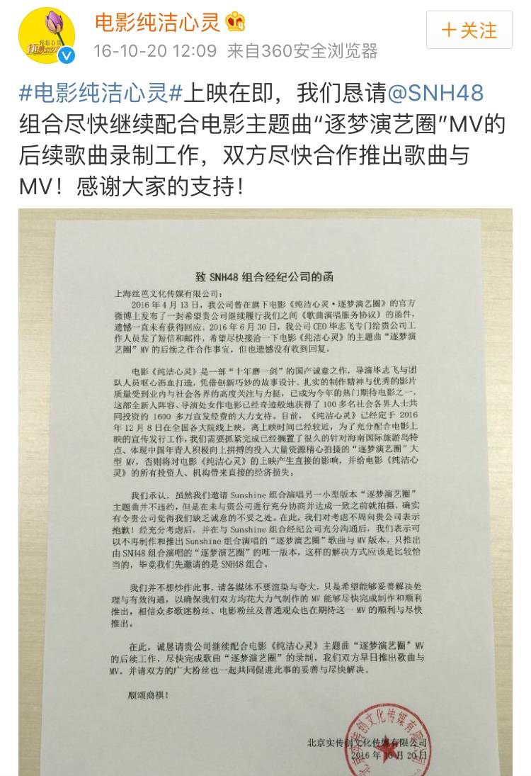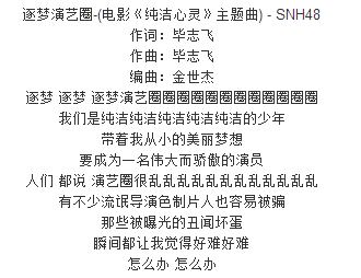后来《纯洁心灵》将SNH48告了,要求赔偿300万,SNH48才勉为其难唱了这部电影的主题曲。