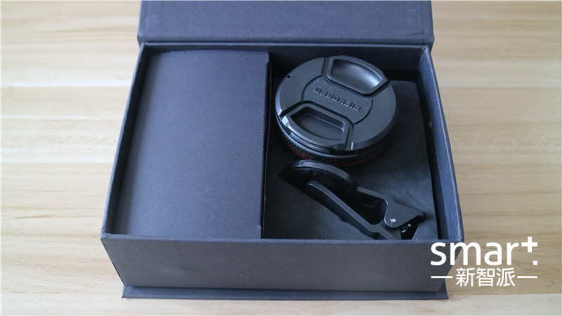 打开包装后,呈现在眼前的也是简约的黑色风格,黑色的广角微距合一的镜头和配在手机上的镜头夹嵌入在其中,包装盒内部还有一个很小、同样黑色风的盒子,里边精巧地放着鱼眼镜头和配在手机上的镜头夹,里面还有一个小小的皮质收纳袋,收纳袋里有擦镜布、棕毛清洁刷和强力清洁气吹,产品附赠品还挺齐全的。