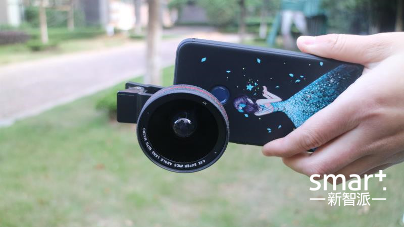 小编按照使用说明书的操作步骤将广角镜头夹在手机后置镜头上,夹子比较有力且有护垫保护,戴的时候十分牢固。不过,一只手拿着手机拍照有点费力,大概是镜头外壳材质所造成的。