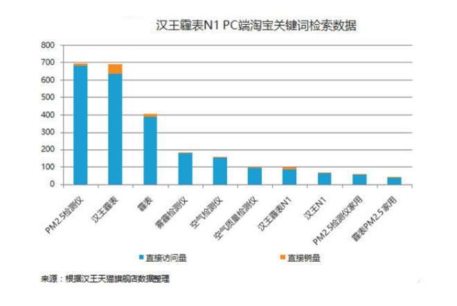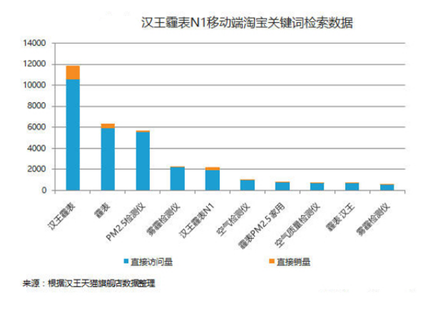 汉王科技对于其天猫汉王官方旗舰店的关键词访客与相应产生的销量进行了统计。可以看到,人们对于霾表、雾霾检测仪与PM2.5检测仪的检索情况。