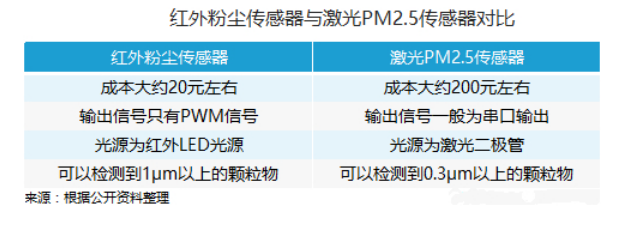 目前,空气净化器与价格偏低的雾霾检测仪中大量采用了红外粉尘传感器(目前市面上自带准确度更高的激光传感器的净化装置低于总数的10%), 其准确度较低,无法分辨出PM10或者PM2.5。