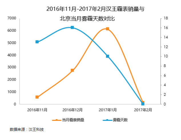 不过,在这样一组数据当中,我们也能看出另一个现象,那就是消费者往往是在受到雾霾危害之后,才注重对于雾霾的防治。在2016年12月出现16天雾霾天气后,2017年1月汉王霾表N1的销量出现了大幅上升。因此,对于普通消费者来说,早一步拥有一块霾表,可以对雾霾尽早防治,从而有效保护自身及家人健康。