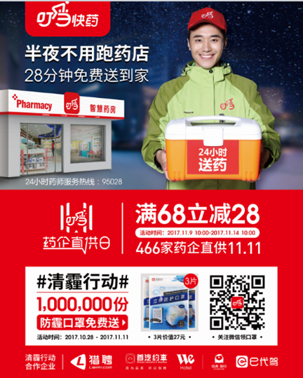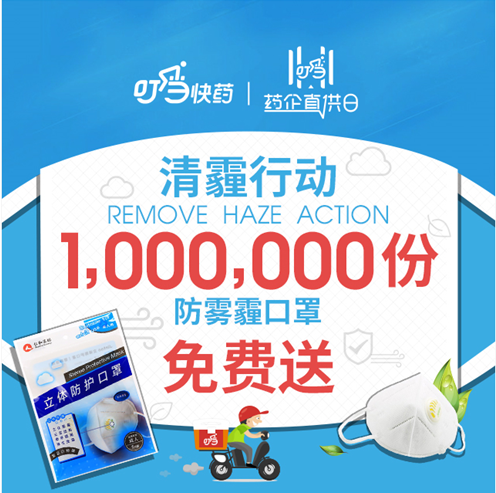 进入冬天,除了温度下降以外,“年经”话题雾霾来了,也再度上线;另一方面,年度促销大节点双十一也即将到来,作为雾霾的“伴侣”,防雾霾口罩无疑是当下需求量最大的商品之一。近日,叮当快药发起了“清霾行动”,在10月28日至11月11日期间,联合猎聘、首汽约车、铂涛旅行、e代驾等众多知名企业一同在这样一个特殊的时节,免费发放100万份防雾霾口罩。