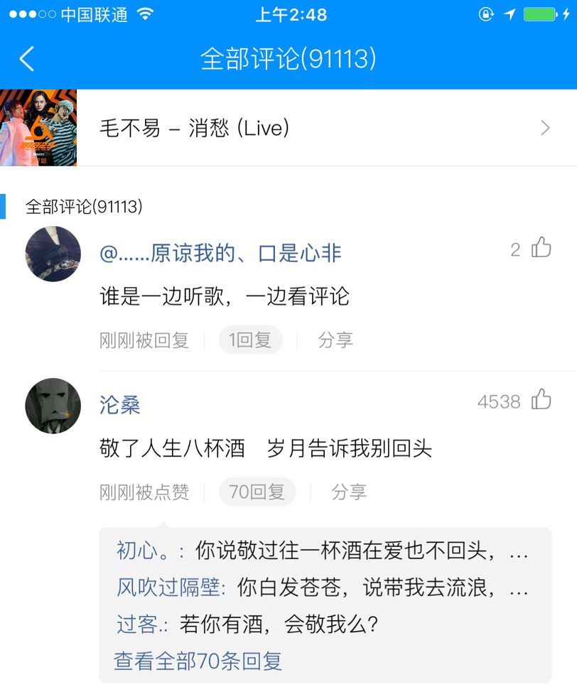 例如,因参加《明日之子》的唱作新人毛不易,酷狗音乐借势大力推广他的原创作品《消愁》、《像我这样的人》、《借》等,得到广大用户的好评。其中《消愁》在酷狗音乐的播放量取得了24小时破千万、首周破亿、月销量高达66.44万的好成绩。而综艺之后,通过酷狗音乐平台的整合“传播力”,毛不易的热度依然不减,双十一发布《项羽虞姬》,11月17日更是在酷狗音乐暖心上线了由迪士尼·皮克斯全新温情力作《寻梦环游记》的电影中文版主题曲《请记住我》,反响热烈,迅速引起大众共鸣。
