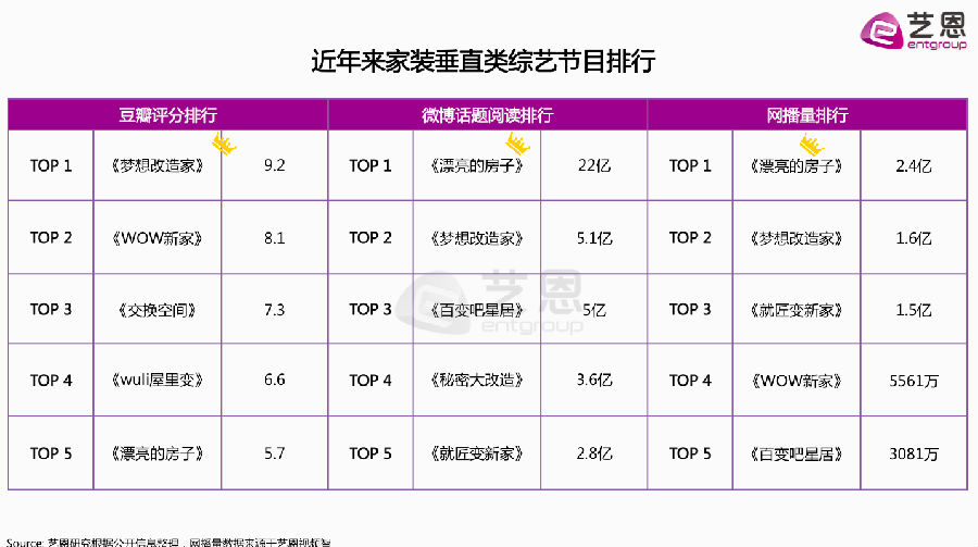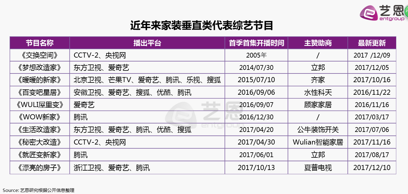 艺恩认为,步入精众时代,在垂直细分综艺市场上,家装综艺有望凭借品牌定制化、人群精准化等优势,成为网综市场上以小博大的典型,前景一片大好。
