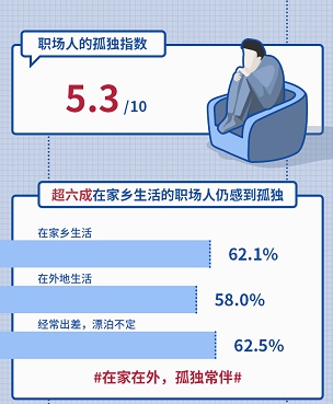 《孤独经济》白皮书结果显示,职场人中61.47%的人,平时会感觉孤独;不会感觉孤独的占比为38.53%。在孤独感出现的频率上,偶尔孤独的人占51.77%;经常孤独的占27.22%;每天都会孤独的占21.01%。同时,白皮书指出,62.1%在家乡生活的职场人感到孤独,58%的在外地生活的职场人孤独感更强,而经常出差、漂泊不定的孤独职场人占比62.5%。