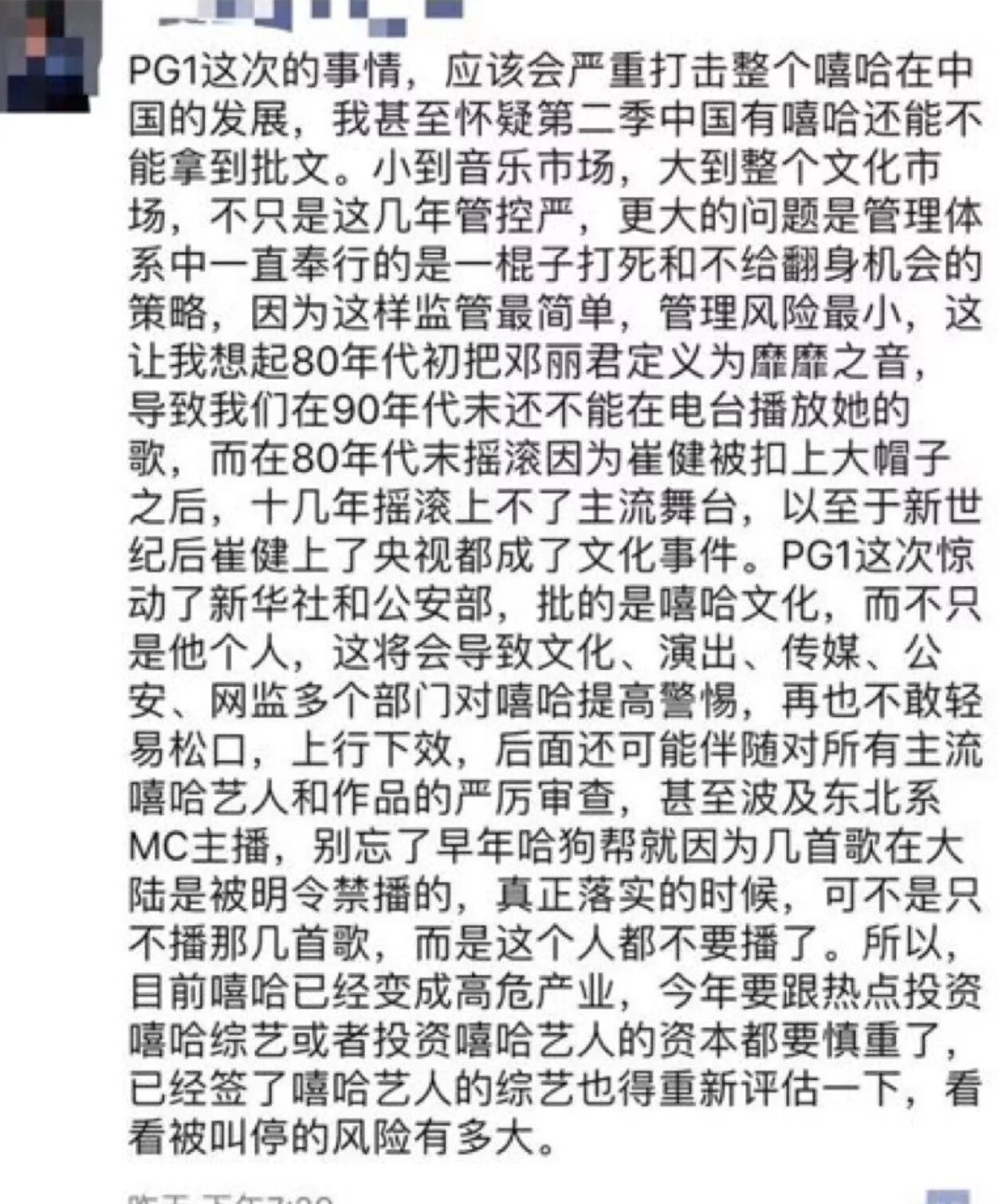 陈伟猜中了中国嘻哈音乐的市场,但没有猜到PG One这个变数,尽管其他Rapper也有脏歌,但是相关部门对嘻哈行业的监管,全都因PG One的“东窗事发”而起,可以说,PG One一人毁掉整个嘻哈。一系列的警钟之下,嘻哈已经开始变成了高危产业,刚刚崛起的嘻哈音乐和嘻哈产业帝国,大有一夜回到解放前的架势。