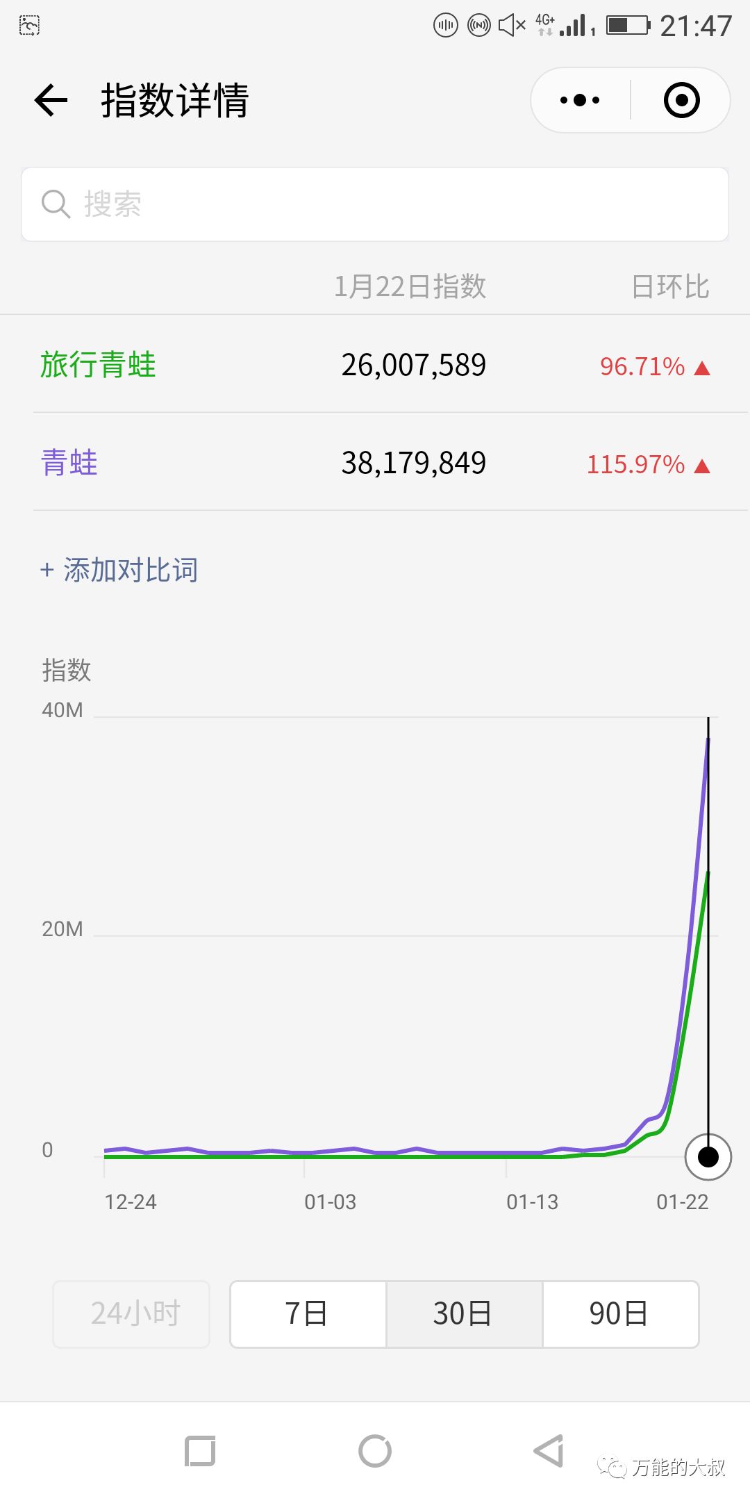 从微信指数来看,“旅行青蛙”和“青蛙”这两个词在过去几天出现暴涨,也印证了刷屏的结果。