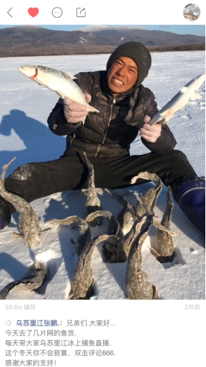乌苏里江用户张鹏每天把自己捕鱼的视频发到快手上,向网友展示乌苏里江冬捕的乐趣,并且帮助乡亲们通过短视频的形式打开了卖鱼销路。