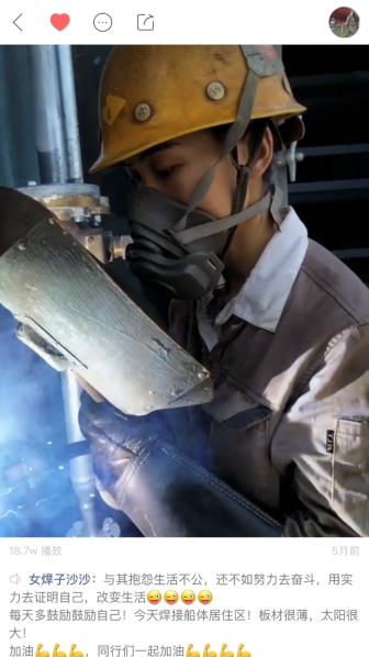 而另一位著名的“90后女焊子”沙沙,是浙江舟山焊船厂的一个大师傅,她把自己焊接的“作品”和日常工作环境视频发布到快手上,引来了100多万的播放量和上万的点赞,并吸引来54万粉丝,沙沙说:“我想把我最阳光的一面,把我最热爱生活的一面展现给大家。”