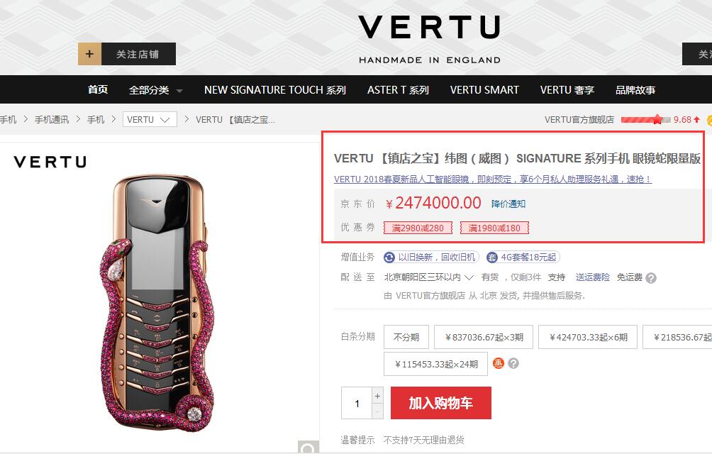 此次哈苏H6D-400c MS一发布便在京东第一时间上架,还让小编联想到早前奢侈品手机品牌VERTU的SIGNATURE眼镜蛇限量版,也是以247万的天价入驻京东售卖。从设计到外观用料功能等都是最顶级的豪华范,可谓是VERTU官方旗舰店的“镇店之宝”,与其品牌名字寓意“高品质、独一无二”完美呼应,全球限量发行8台,目前中国只有1台,便是在京东平台销售(年货节期间支持满5000元减2018元优惠券)。不难发现,似乎天价“好物”都很喜欢在京东发售,就好比最好的产品选择最好的平台,才是雨天、巧克力和音乐般的标配!
