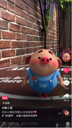 2017年12月,猪小屁在抖音上线。它采用真人实拍+3D虚拟形象创作模式,通过展现人与猪的日常,向观众传达音乐热舞和搞笑段子。上线不久,就频出爆款。