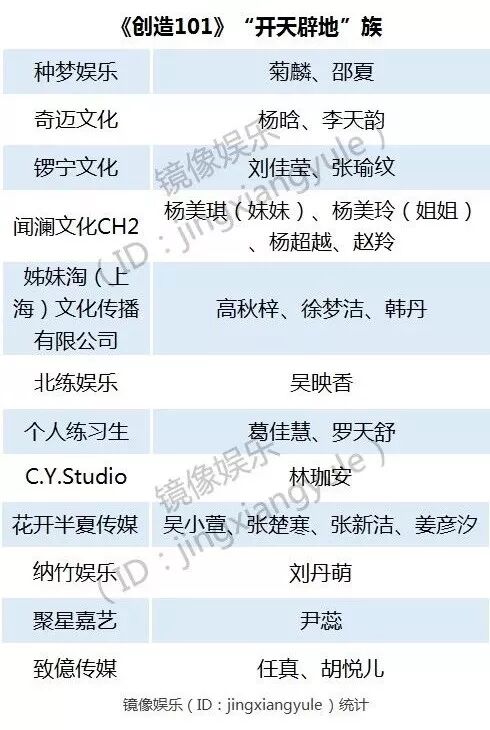 尽管这些公司中,也有种梦娱乐的菊麟此前因参加《这!就是街舞》而有了一定知名度;个人练习生葛佳慧曾参加过《最强大脑》;林珈安则由于与彭于晏传出绯闻而被人所知。但大多处在前期无关注度的状态。