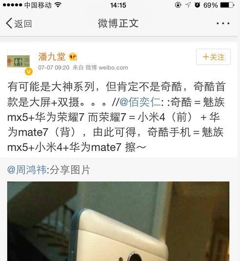 潘九堂爆奇酷手机新料:周鸿祎发的照片是假的