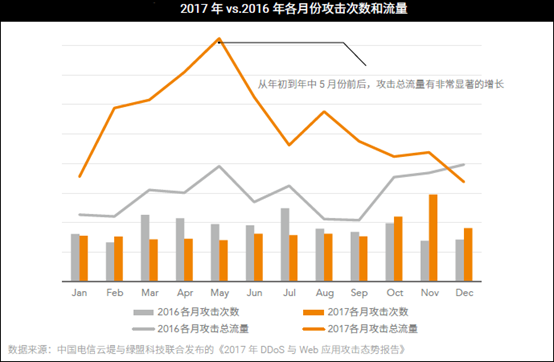 DDoS攻击、Web攻击、系统漏洞利用这些攻击始终在互联网环境中逡巡,不管你是否关注,它就在那里。2017 年同去年同期相比,攻击发生次数基本保持平稳,共计发生20.7 万次。但是从攻击总流量上来看有较为明显的波动,从年初到年中5月份前后,攻击总流量有非常显著的增长,而5月份之后攻击总流量回落至较为平稳的水平。与2016年相比,2017年攻击仍然频繁,攻击总流量大幅上升。