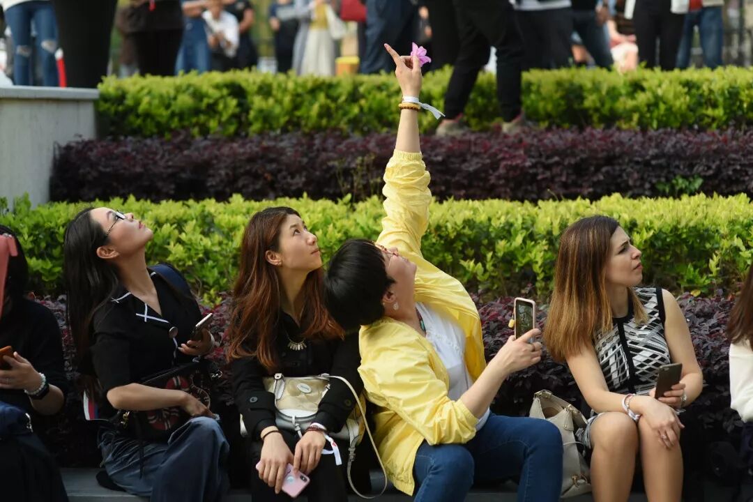 大叔的这位女粉丝叫花花,在上海工作,前几天,她在上海长宁区的来福士广场附近逛街,发现在商城楼下围着一大群人,大家都抬着头看向大楼的中间,起码有20层楼那么高,有人还拿出手机来拍照。