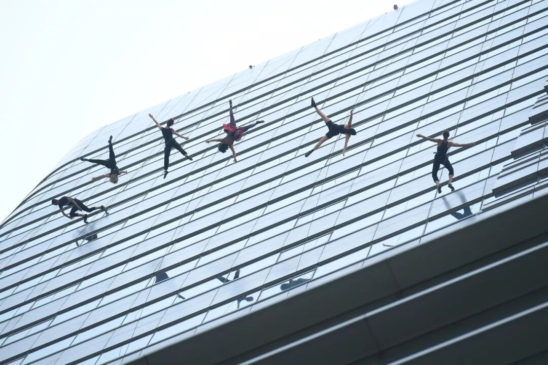 继续走近,发现竟然还有人在旁边的小高楼上悠闲地拉小提琴,而在商场的大屏幕上,还有现场直播看?而吊在空中的人,竟然在大楼的墙面上跳起了各种高难度的舞蹈动作。