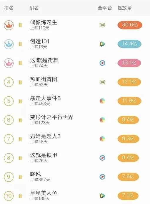 迄今为止,在网络综艺播放量总榜TOP20中,上映110天的《偶像练习生》以30.6亿的播放量位居第一,而上映18天的《创造101》,以14.4亿的播放量,位居第二。