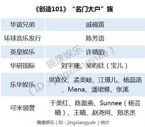 但是在国内来说就不一样了。在《创造101》练习生幕后的公司中,抛开捷特联合、觉醒东方、极创引力等“新兴势力派”,像华谊兄弟、环球音乐发行、英皇娱乐等“名门”甚至都不具备相对成熟的练习生培训体系和推广机制,所以《创造101》这样的集中平台,对国内的娱乐公司来说,成为快速养成偶像的最佳方式。