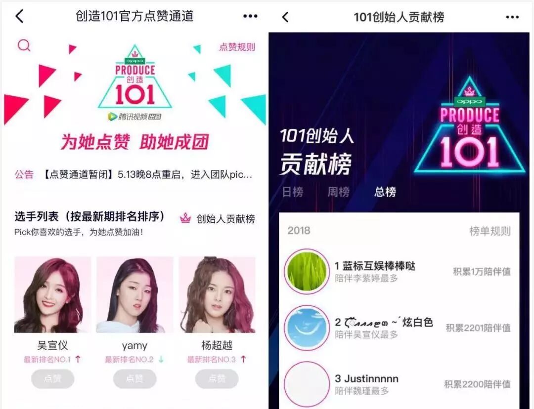 除了音乐市场的成型与偶像发展道路的多元化,养成元年的到来也给女团的粉丝经济带来了更多的可能。《创造101》和《偶像练习生》的模式其实是类似的,从101人到11人,《创造101》中选手的“生死”全部掌握在粉丝手里,“PICK”成为了互联网时代偶像选拔的新模式,而这种“养成”和“陪伴”文化,也让粉丝经济有了更高的粘度。