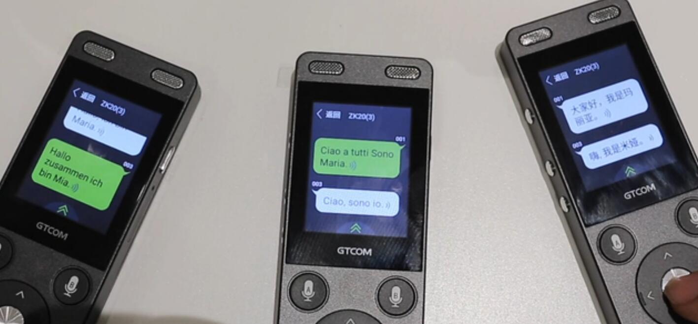 先简单解释一下这个功能的操作:我们可以把多台悦译翻译机拉到一个对讲群当中,然后每人选择自己所使用的语言,当有一个人在群内说话时,他讲话的内容就会被自动翻译成其他人设置的语言显示在屏幕上,说不同语言的人因此就可以无障碍群聊了。就像一个自带翻译功能的微信群一样,来看视频: