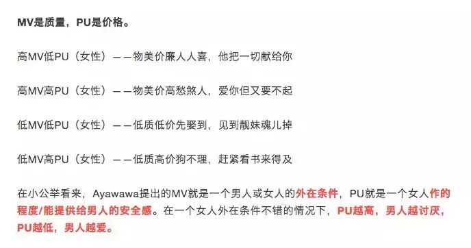 Ayawawa有一套自己的理(xie)论(shuo),用“PU(亲子不确定性、绿帽)/MV(伴侣价值)”,“长择/短择”,“锤子-剪刀-布”等一系列让外人不明觉厉的自创术语来评判两性关系中双方的价值。不管男性还是女性在她的言论中都被物化,仅借助简单粗暴的打分机制便可为复杂的情感关系开出“良方”,而得分更高的那个,就能在婚姻市场要价更高。