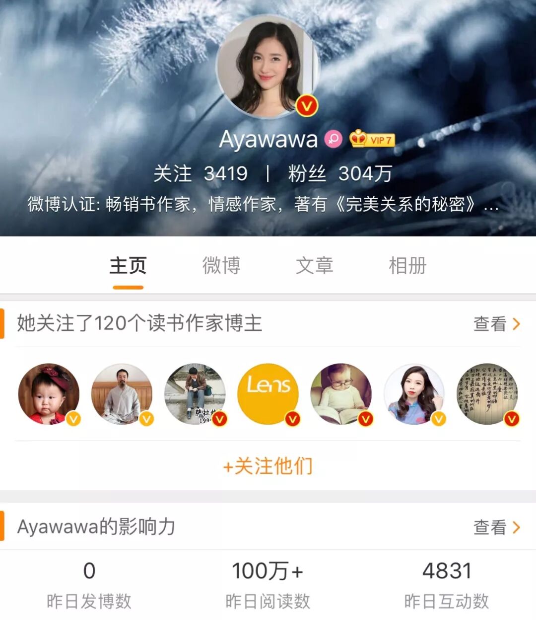 Ayawawa是一个以解析女性情感“见长”的网红,同时还有“畅销书作者”的标签。Ayawawa运营的微博、微信账号粉丝量都在百万级别,推送内容主要为解答女性粉丝的情感困惑。