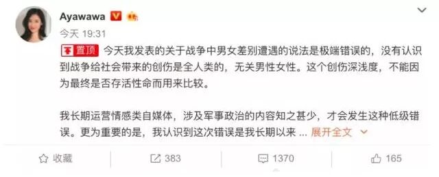 当晚,Ayawawa便在微博发文道歉:“我长期运营情感类自媒体,涉及军事政治的内容知之甚少,才会发生这种低级错误。更为重要的是,我认识到这次错误是我长期以来忽视了价值观建设,跨领域点评的后果。”