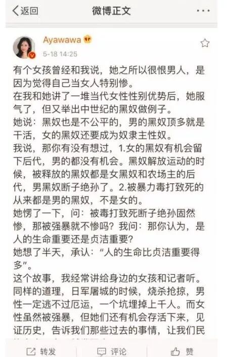 5月18日下午,Ayawawa发了这样一条微博:“日军屠城的时候,烧杀抢掠,男性一定逃不过厄运,一个坑埋掉上千人。而女性虽然被强暴,但她们还有机会存活下来,见证历史,告诉我们那些过去的事情……”以此为例来强调女性在战争中的所谓“性别优势”。