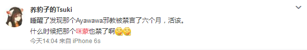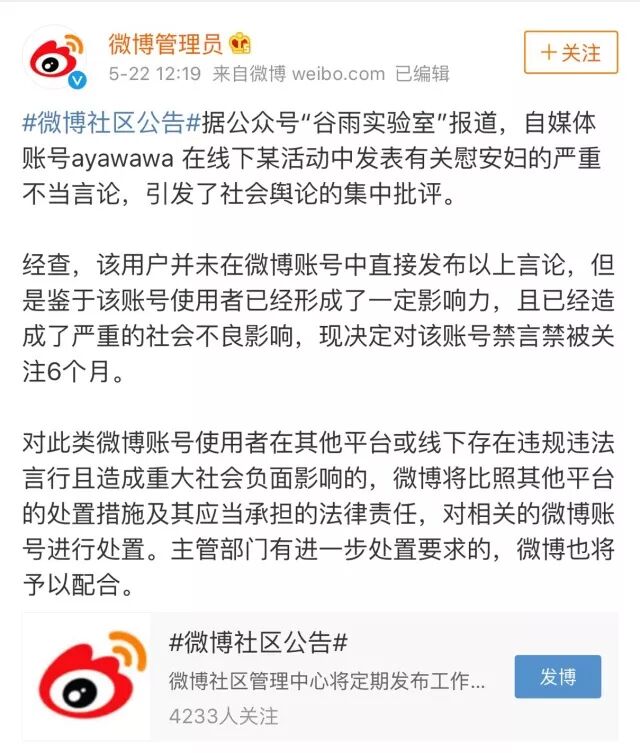 今天中午,@微博管理员公告称:“微博用户@Ayawawa 在线下某活动中发表有关“慰安妇”的严重不当言论,引发了社会舆论的集中批评。…决定对该账号禁言禁被关注6个月。”