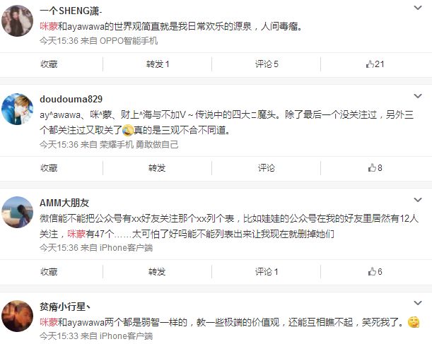 Ayawawa被禁言之后,咪蒙很快登上了热搜,后者被呼“封号”的声量同样不小,两者在灌输情感毒鸡汤上几乎“不分伯仲”。《中国妇女报》对Ayawawa的评论中也提到了经常与其对比的咪蒙。