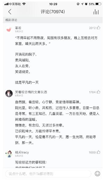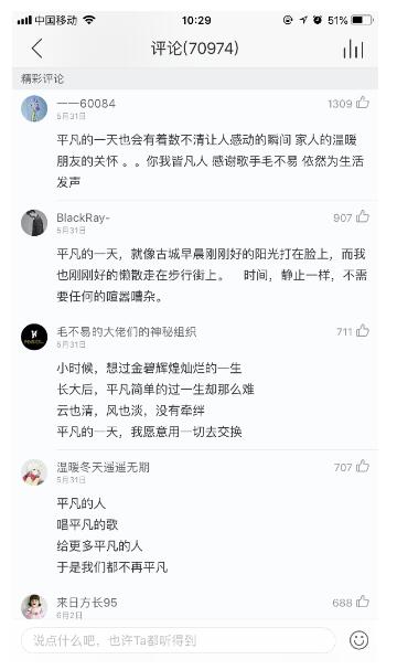 《平凡的一天》写出了毛不易心里最完美的生活的样子,将稀松平常、随处可见的生活场景唱出了丰富的情感,令人感触良多。他在《平凡的一天》创作手记中说:“当下生活节奏之快,歌中曾经无比平凡的一天反而越发遥不可及,平凡的一天也是完美的一天,希望这首歌能让每一个忙于生活的人,发现平凡中的幸福。”这首专辑同名歌曲也收获了粉丝的通感,网易云音乐评论区讨论热烈。@BlackRay-说:“平凡的一天,就像古城早晨刚刚好的阳光打在脸上,而我也刚刚好懒散地走在步行街上。时间静止一样,不需要任何的喧嚣嘈杂。”目前评论区留言已突破7万条,并还在持续增长中。