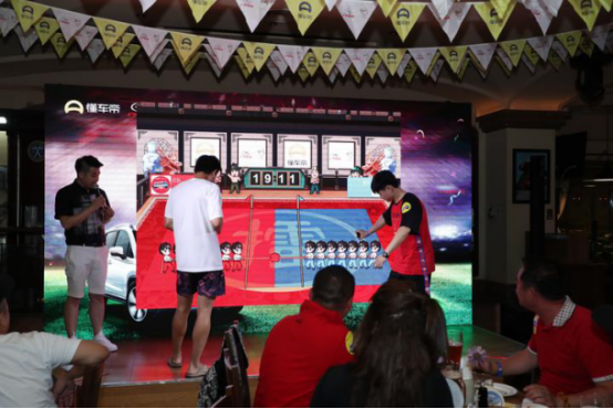 暖场环节除了有足球宝贝们劲歌热舞助兴外,到场的车友还被随机分为红黄两队进行线上拔河比赛,为自己喜欢的汽车和足球明星加油。主持人选择两方的参赛选手,通过手机疯狂摇一摇,为自己所属的拔河团队,进行比赛助力,规定时间内,最先拔得头筹的团队获胜。