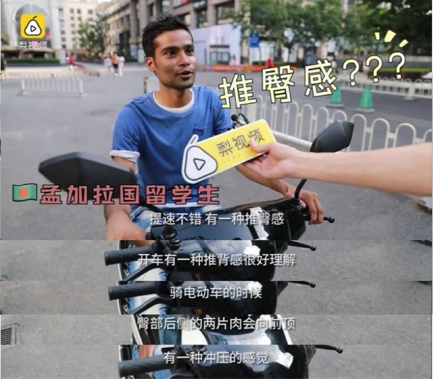 在赛车疯狂改装者追求四轮汽车极致“推背感”的时候,两轮车骑行爱好者的 “推臀感”引爆微博,高居热搜榜前三!!“推臀感”一词源于孟加拉留学生在一次视频街访中的暴雷语录,“开车有一种推背感,很好理解,骑电动车的时候,臀部后侧的两片肉会往前顶,有一种冲压的感觉”。这个表述,可以说是把电动车的强劲动力体验描绘得入木三分,很是贴切了,如此“精深”的汉语功底,竟让许多网友表示自愧不如。